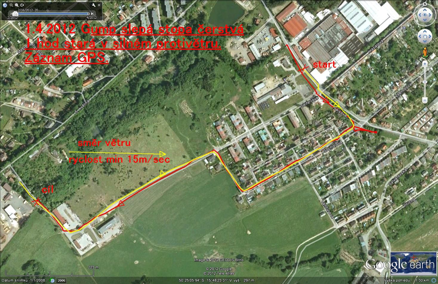 Gump šel 1.4.2012 slepou stopu. Předcházela jí s 30 minutovým předstihem úspěšná negativní stopa na kladeče, který potom v 9 km vzdáleném městě našlápl klasickou trasu. Trochu jsem marodil, a tak měl Gump po desetidenní pauze naplánovanou čerstvou, 1 hod. starou trasu. Na čerstvých stopách udělají naši psi obvykle nejvíc chyb. Gump sice „přepálil“ první křižovatku, ale opravil se a v silném protivětru trasu bezpečně dokončil.