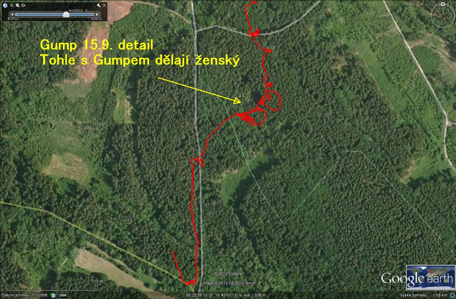 Cilka přerušila z neznámých důvodů svoje hárání v srpnu, aby na něj v září navázala s plnou silou. Navíc jsou v domě zedníci, a tak je Cilka přes den oddělená od Gumpa pokaždé v jiné místnosti, podle toho, jak stavba pokračuje. Gump to dost těžce nese. Řekl jsem si, že by měl přijít na jiné myšlenky a stopa, ať už vzhledem k jeho situaci dopadne jakkoliv, mu nemůže uškodit.Dana nám šlápla terénní stopu v kopcovitém terénu mezi Vřešťovem a B.Poličany. Trasa byla značená a jejím cílem, kromě již popsaného, bylo zpřesnění práce u středně starých stop. Stáří 5 hodin, počasí – zataženo až oblačno, vítr , mírný SZ. Výkon Gumpa – „střídavě oblačno“. Trasa byla celkem cca 3,2 km dlouhá, ale my jsme ušli 3.9 km.Gump celou dobu poctivě makal s nízkým nosem. Nicméně úseky, kdy šel jako z příručky, střídaly pasáže, kdy byl myšlenkami hodně daleko. Poměrně dobře je to vidět na záznamu GPS. Stopu úspěšně dokončil po 55 minutách. Bohužel baterie v kameře skončila o 5 minut dřív
